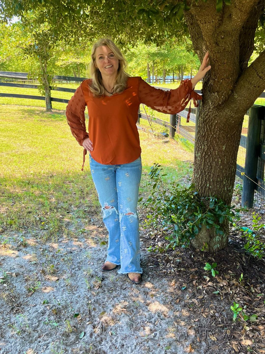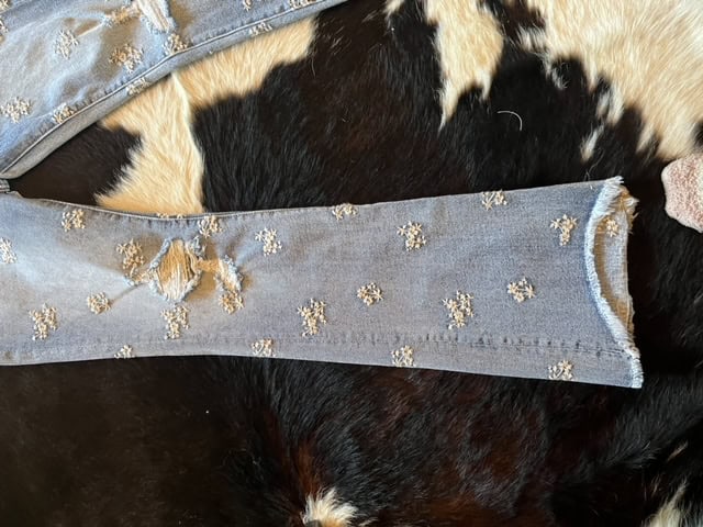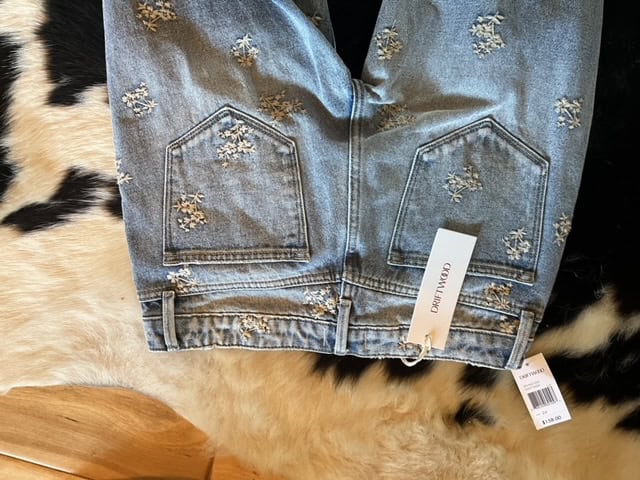 These Driftwood Jeans in distressed clover print make a splash in the fashion world. Pair them for a night out or an afternoon shopping. These are the fashion looks that are classic and never go out of style. A light wash flare era jean with clover prints and random distressed tears on legs and knee. Model in photo is 52 years old and 17 years old, these jeans fit and style regardless of age 33" inseam and 19" leg opening. Machine Wash cold.