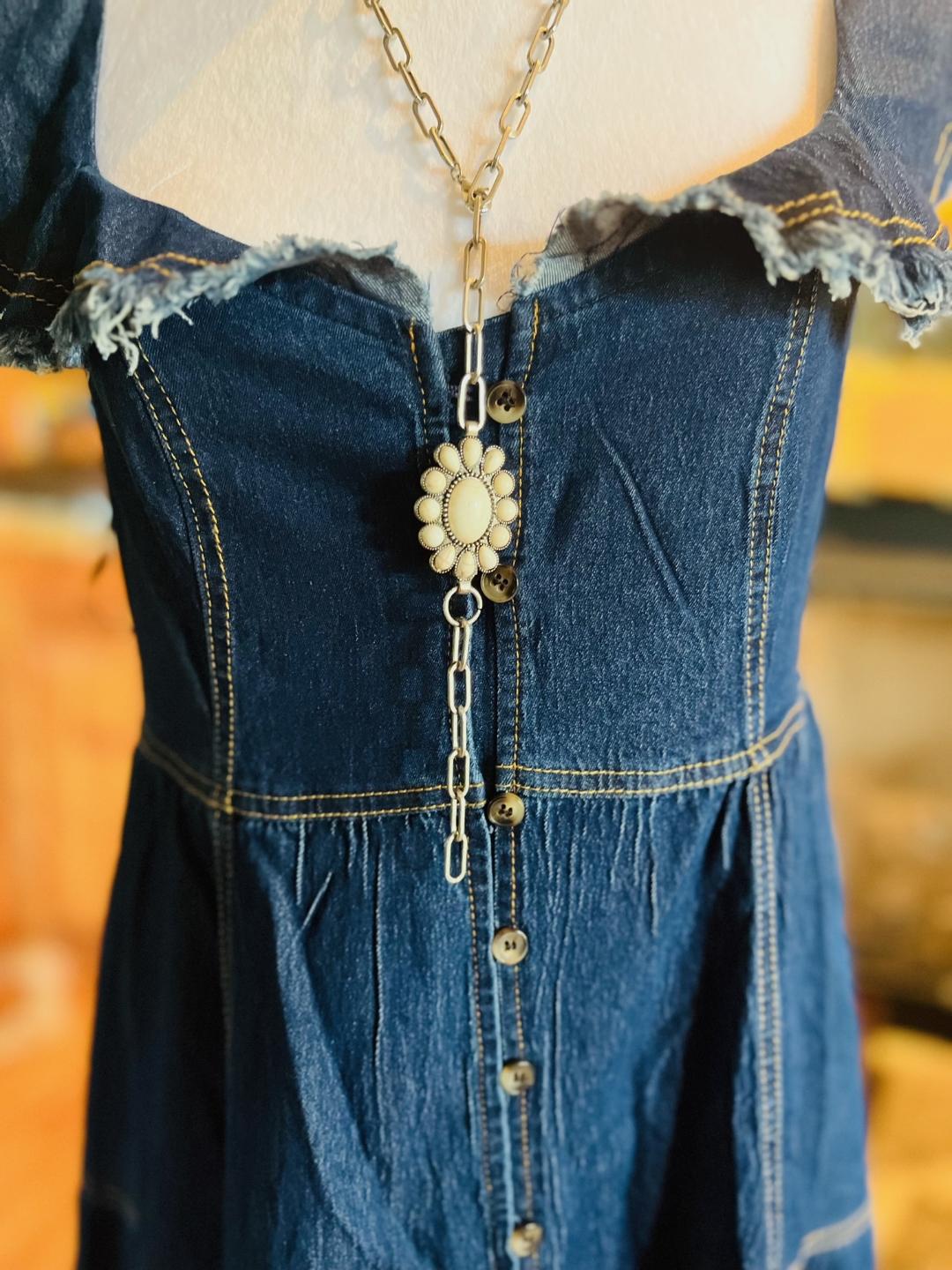 Beautiful Western Style made right for the cowgirl in us all. Buttons down the front with elastic weaving in the back of the dress to keep it figure hugging and flattering. Sleeves are either on the shoulder or can be worn on the sides of the shoulder. Comes in many sizes and looks incredible on everyone. Flash it up with a cowboy hat and some Native American Jewelry and you are ready to hit the town or the rodeo.