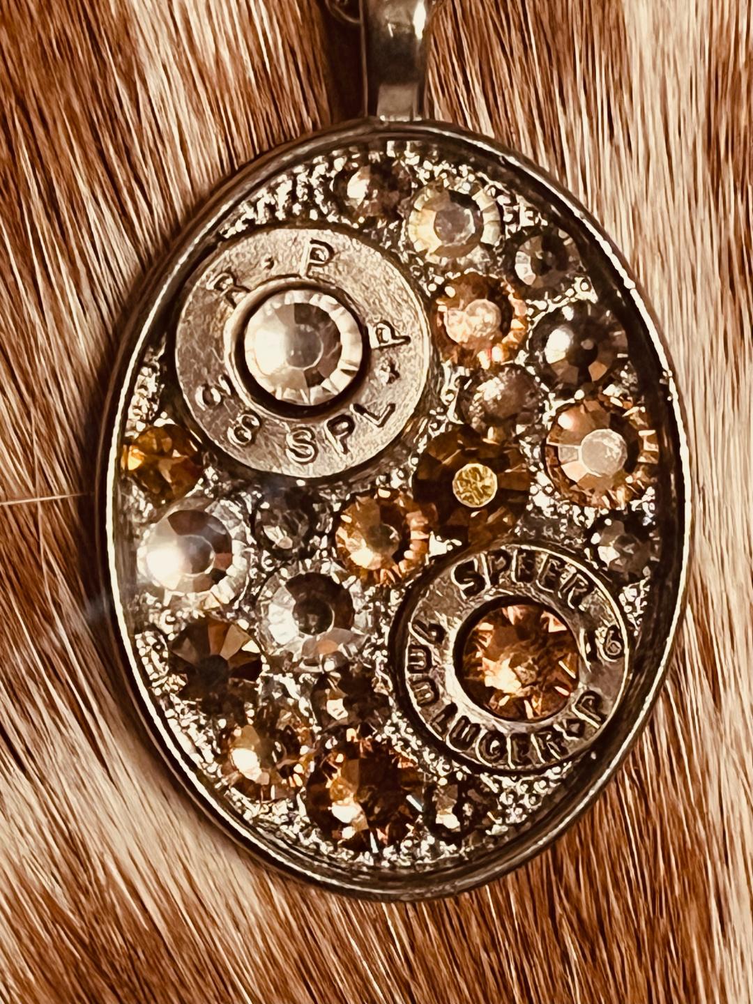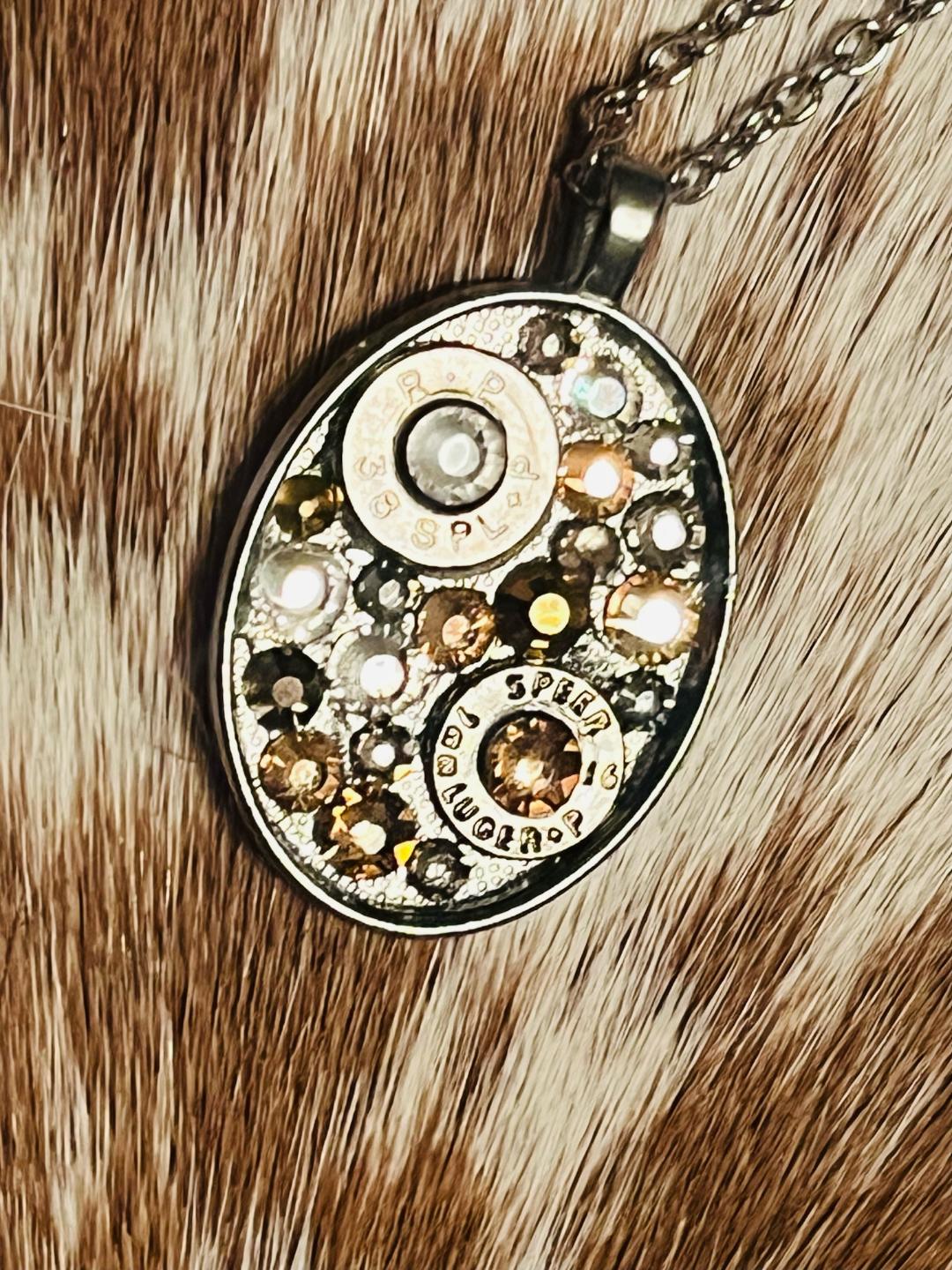 The golden oval Swarovski crystal and bullet shell necklace is handmade and comes on a 24" Chain. Blends perfectly with other pieces and layers beautifully. Chain is Silver over Brass based, and crystals are gold and silver colored. Bullet shells are multiple calibers. This is a fun necklace that is custom made so no two are exactly alike. Makes a great Birthday, Mother's Day or Easter gift for those that are hard to shop for because it seems they have everything already. Different! Cool! and Unique!