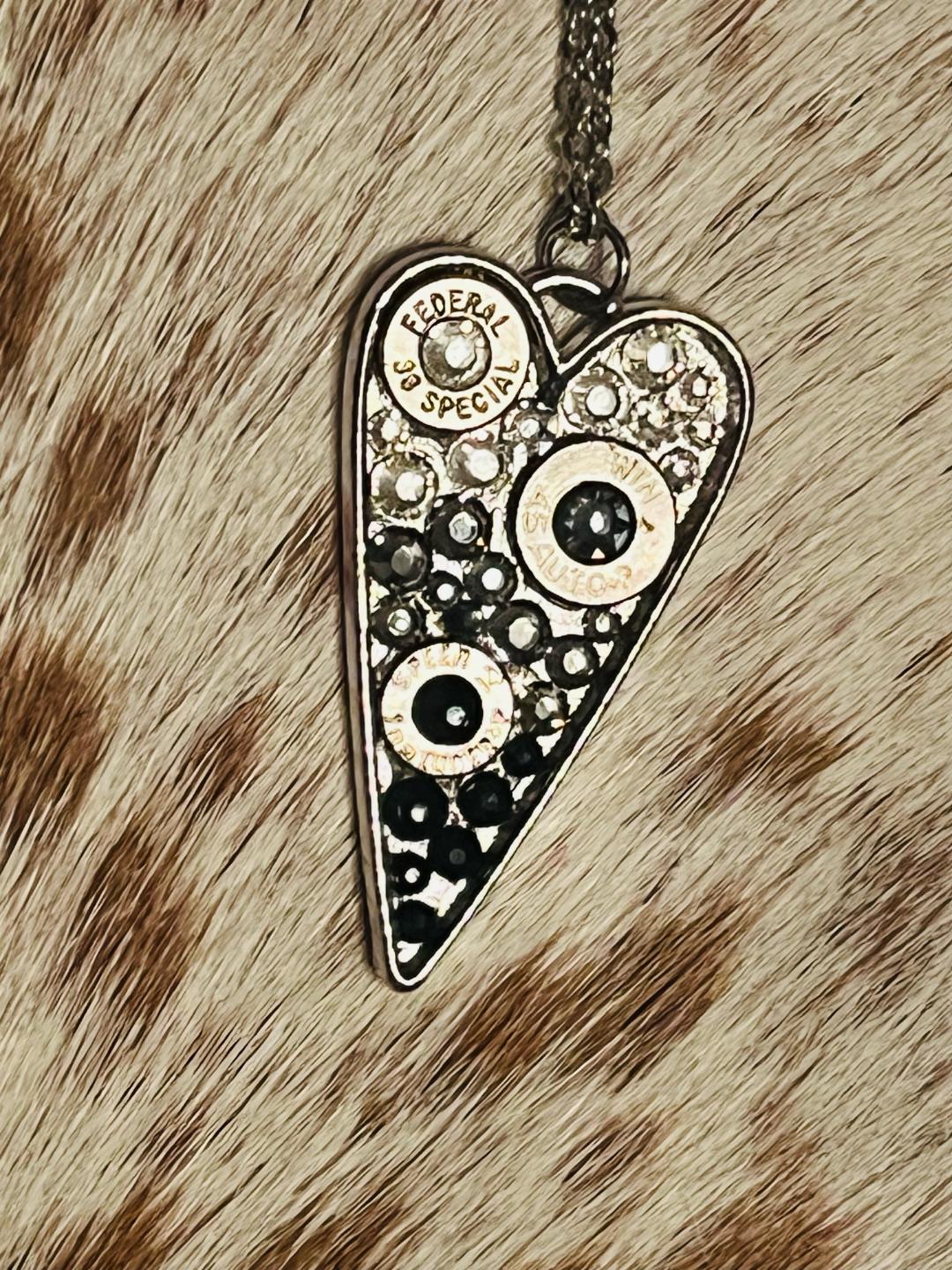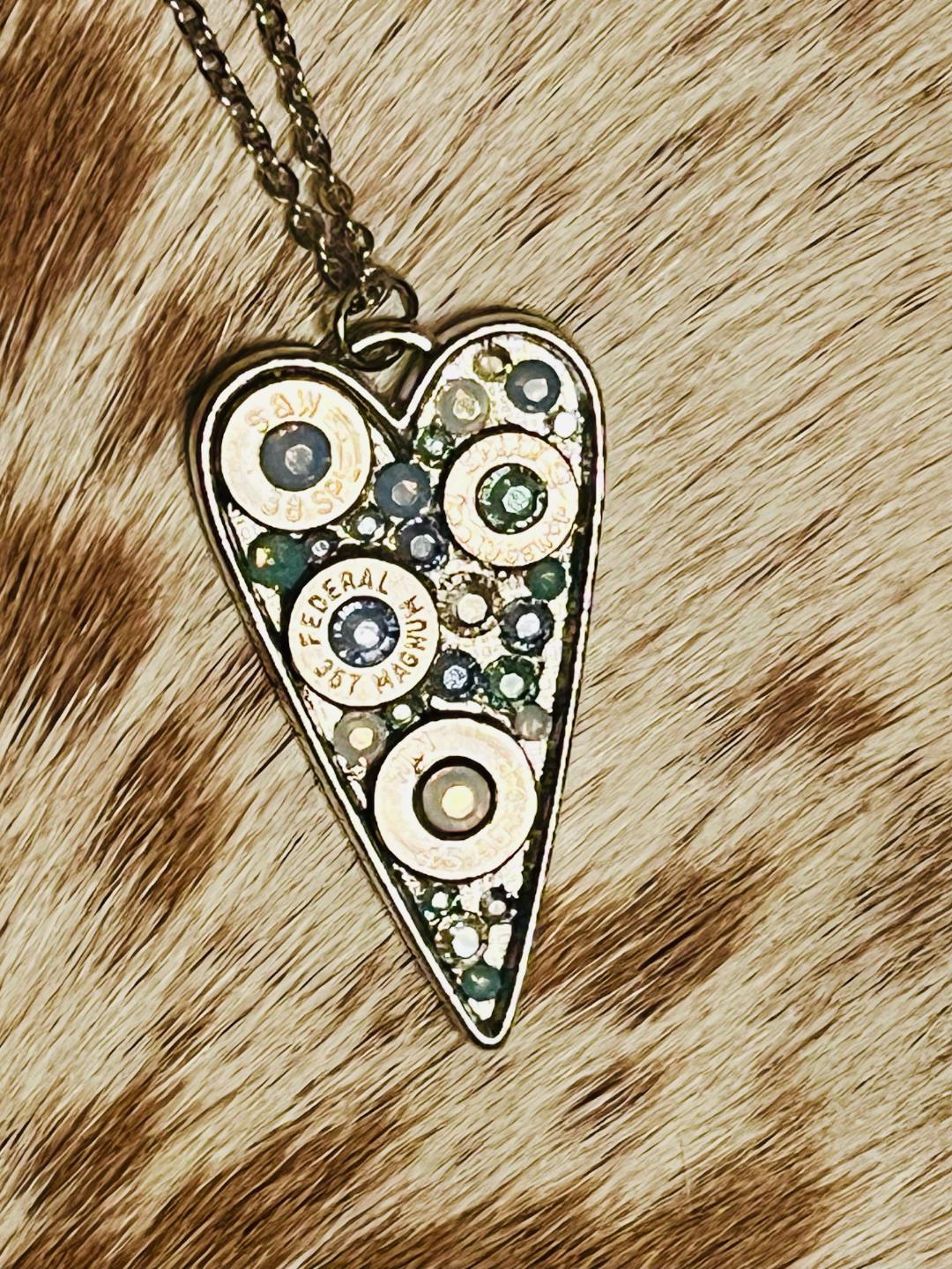 A fun and flirty necklace with just the right amount of cowgirl touch. Swarovski crystals and different caliber shell casings are placed in the heart pendant. This heart shaped pendant is handmade with Swarovski crystals and multiple bullet accents. Pendant is 2" long and 1" wide. Chain is silver over brass plated and 24" long.