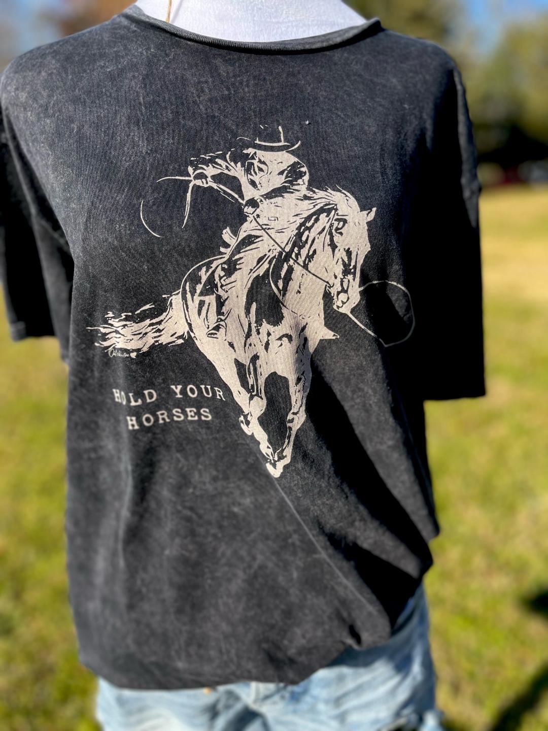 Distressed black look with tan horse and rider across the front ready to lasso with the logo Hold your Horses.