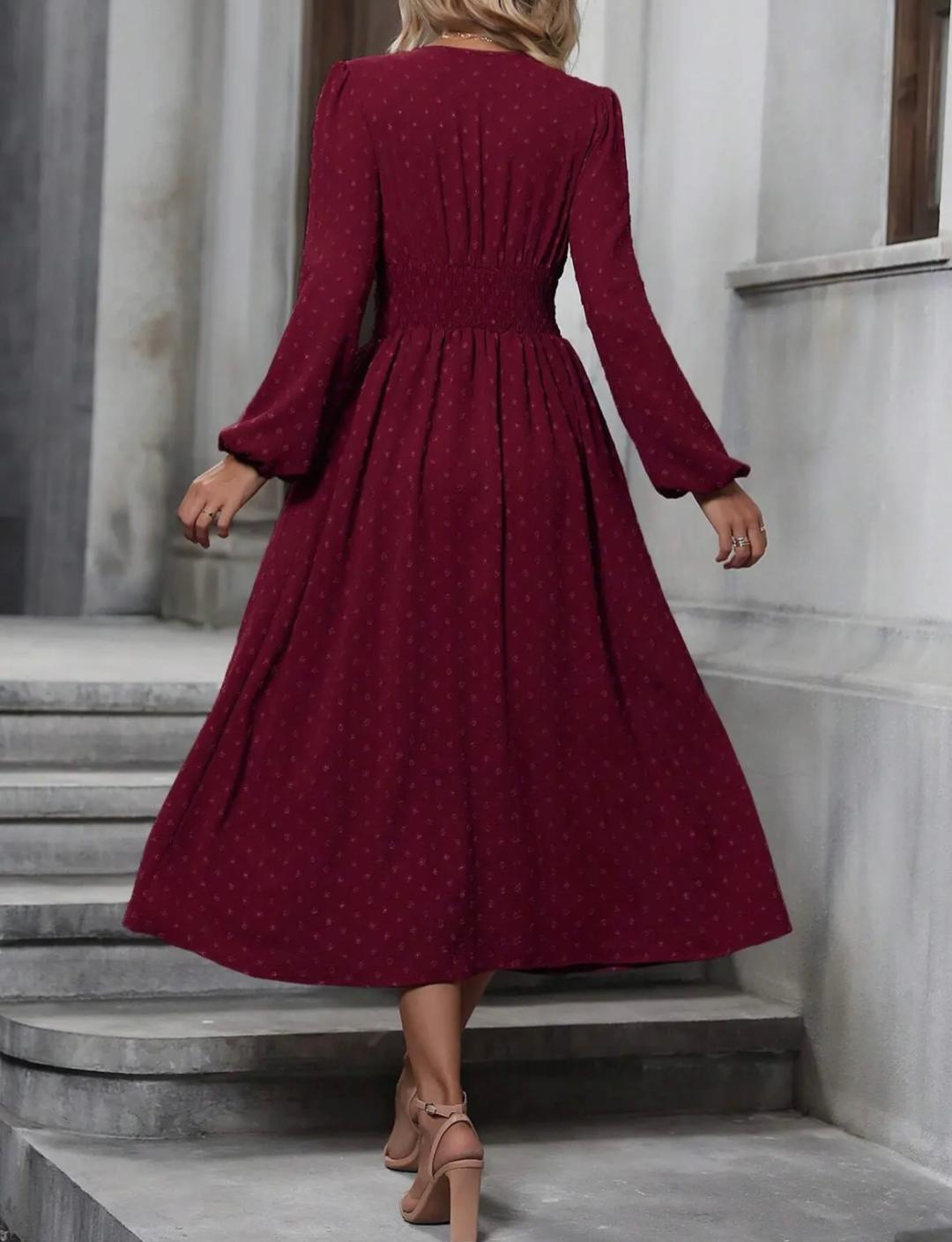 The long sleeve Swiss dot dress comes in two fabulous colors. Wine and Navy Blue. This dress slips over the head and has a rucked center that helps create a slim look. The V-neck is classy and not too low and the long sleeves are perfect for the winter/fall months. ( more photos coming soon)