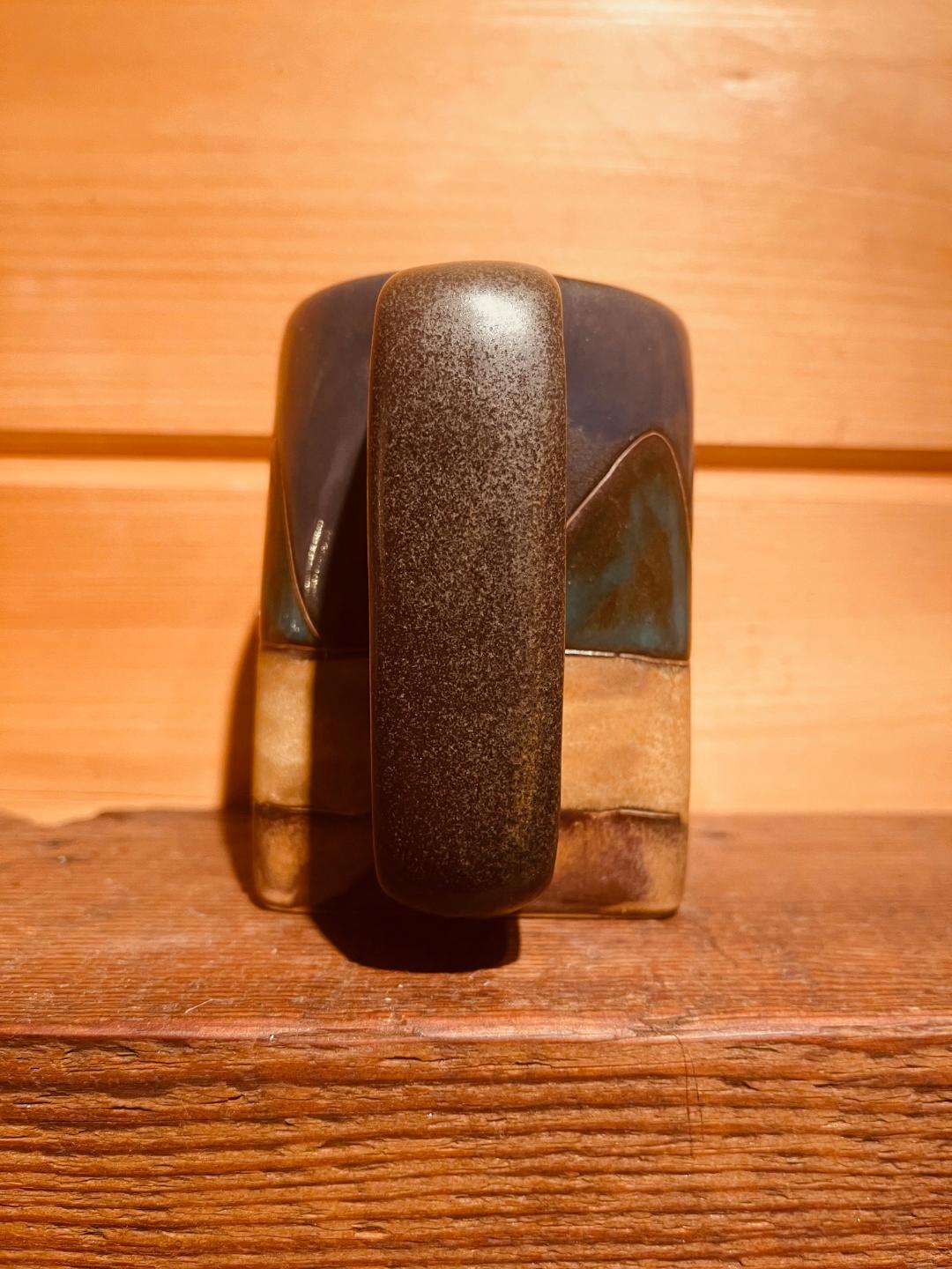 The running horses' mug by Myra is an interesting piece. made in a square so the horses are running free around the mug. Beautiful colors highlight the different horses and their detail.