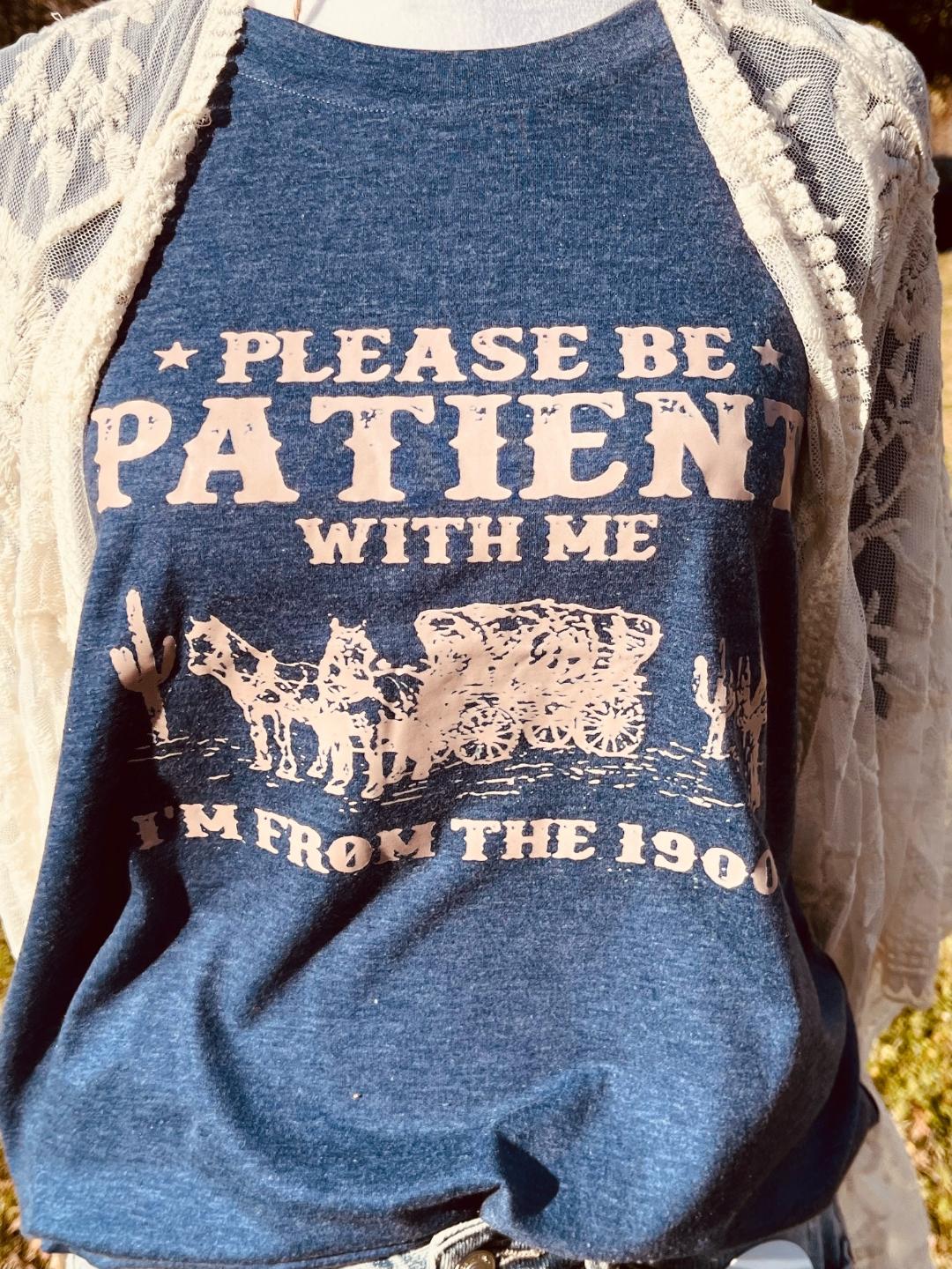 This navy blue t-shirt has a cute little saying across the front, " Please be Patient with me, I'm from the 1900s" with a stagecoach and horses stenciled on. Comfortable and easy to wear and guaranteed to bring a smile to the faces of those around you. Made of 60% polyester ,35% Rayon and 5% Elastance.