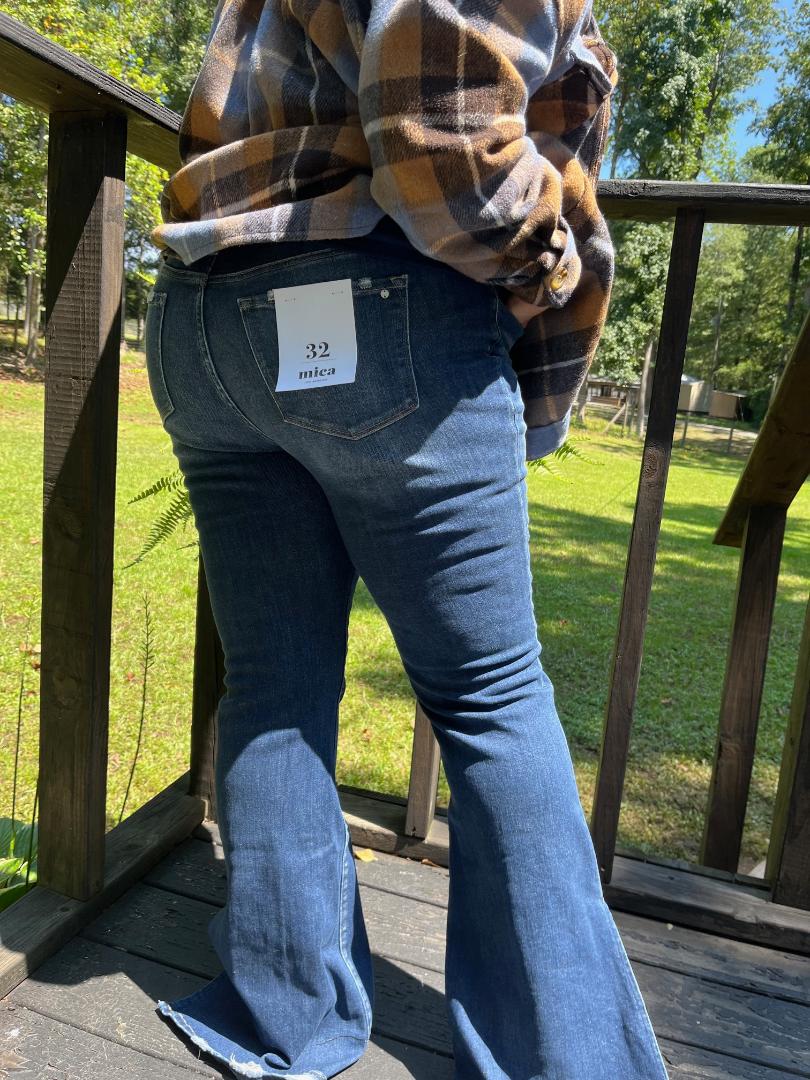 These are the perfect jeans for showing off your amazing boots. We love boots and have so many pairs we thought why can I only see the toe of my fabulous boots. Well, here comes the peek-a-boot jeans from Mica denim. 34 " inseam and easy fit mid-rise flare leg with a little stretch for comfort without feeling baggy. These jeans keep their shape. They also go far to improve the tushy. Some jeans flatten but these Mica denim flatter. Dark wash with frayed hem and pockets. You'll love these. It's everything you want in one pair of jeans.