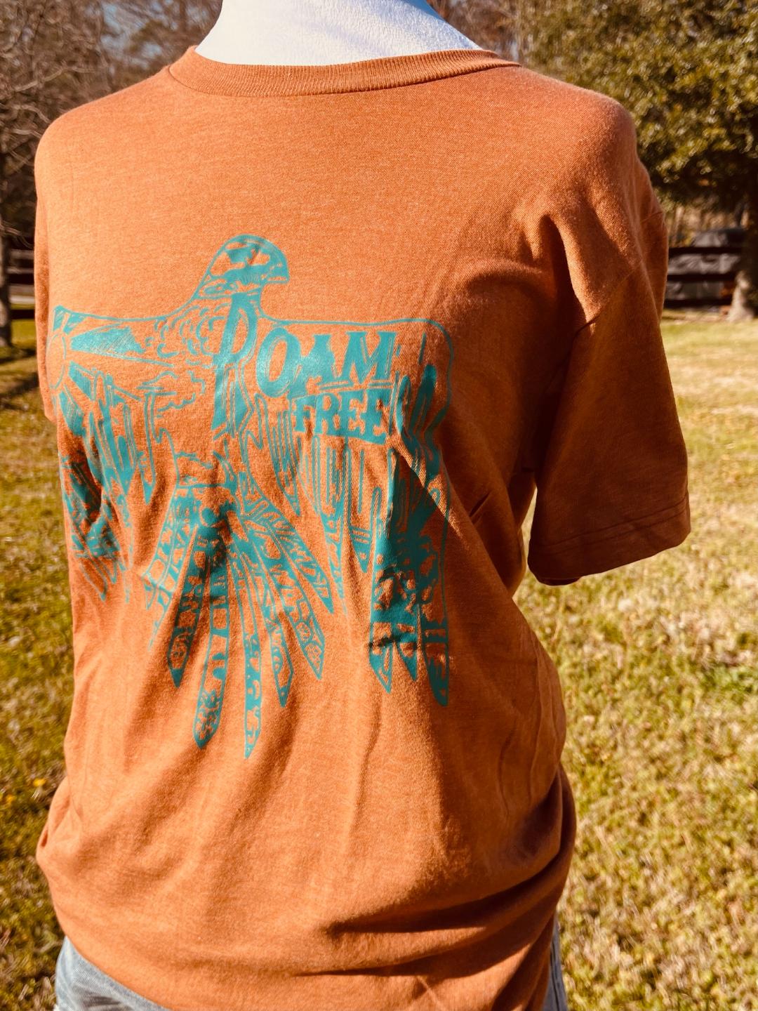 Roam Free is the Cowgirl/Cowboy way. This t-shirt brings out the bohemian in all cowgirls. The Rustic orange and green print of the eagle just screams wild times ahead. Dress it up with layers of necklaces or wear it with jeans on a awesome trail ride. Show your cowgirl way. 50% cotton and 50% polyester. Soft and cozy, and gets more so with each wash.